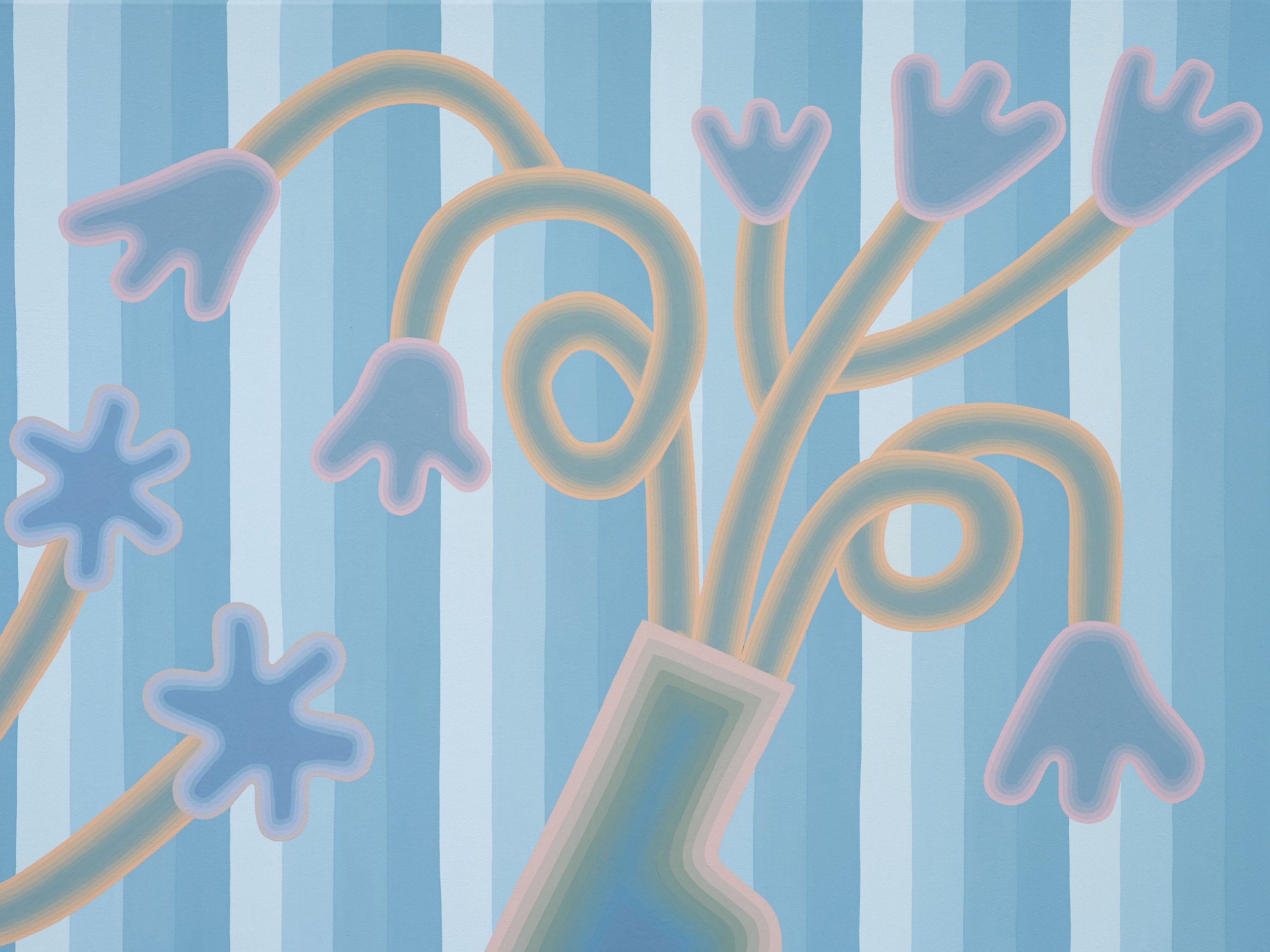 Annie Pendergrast’s paintings draw on the visual language of flowers, vases, stripes, grids, and looping forms, assembling a world where ornament, pattern, and precision converge. Rendered in crisp gradients and graphic color combinations, her compositions feel at once playful and controlled: blooms swell to near-cartoon proportions, stems coil into curling lines, and patterned grounds—gingham, stripes, checkerboards—flatten space while intensifying visual rhythm. While flowers have long served as symbols of beauty and femininity, Pendergrast treats them as formal devices, using their familiar shapes as a means to test color, structure, and compositional tension. Still lifes emerge not as quiet domestic scenes but as sites of compression, where decoration and craft are heightened, and where contemporary design aesthetics give rise to both pleasure and subtle uncanniness