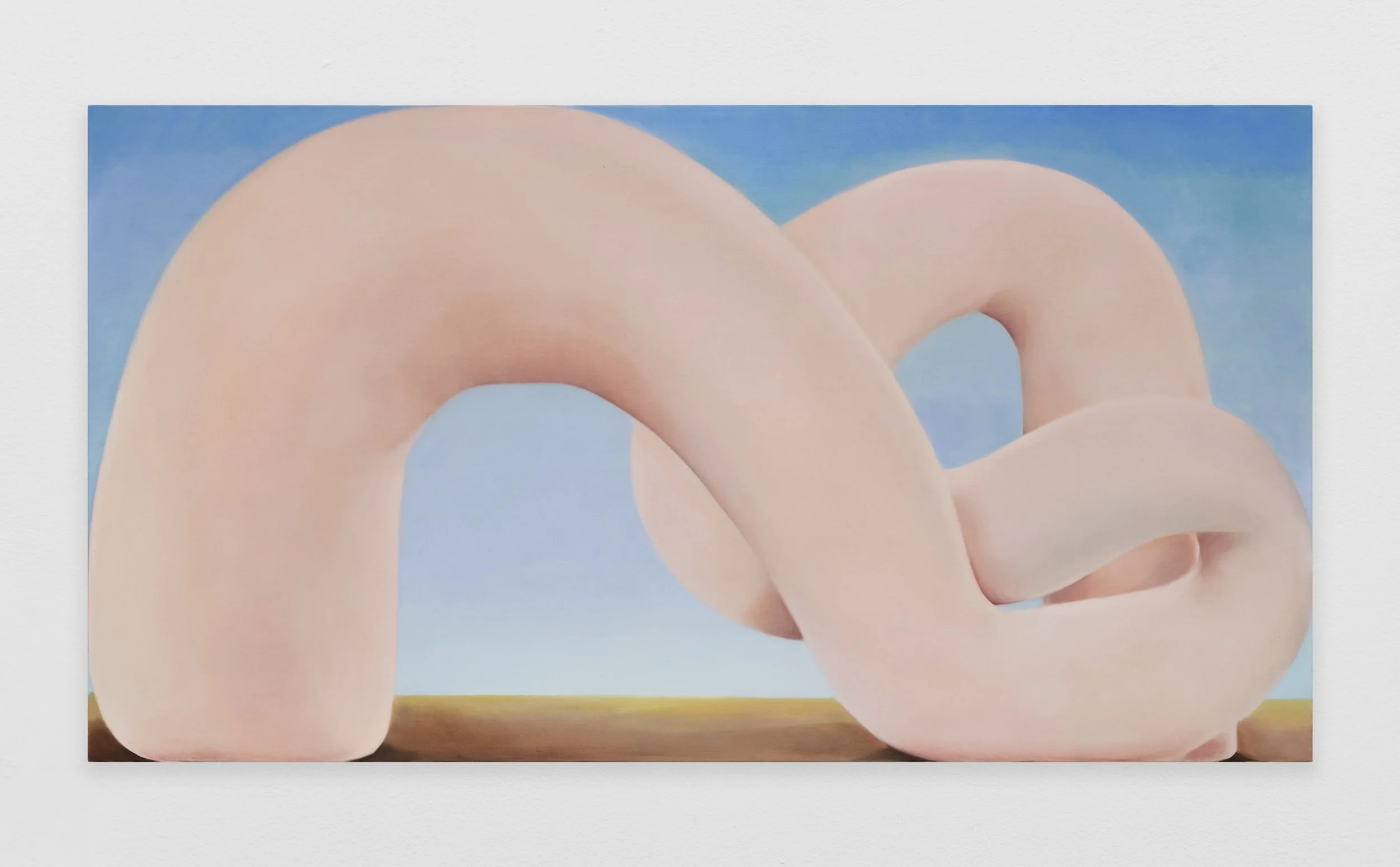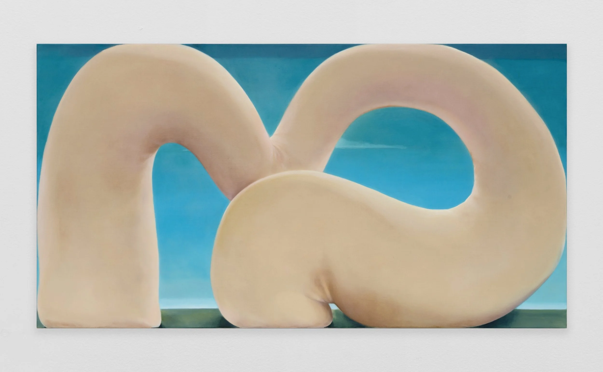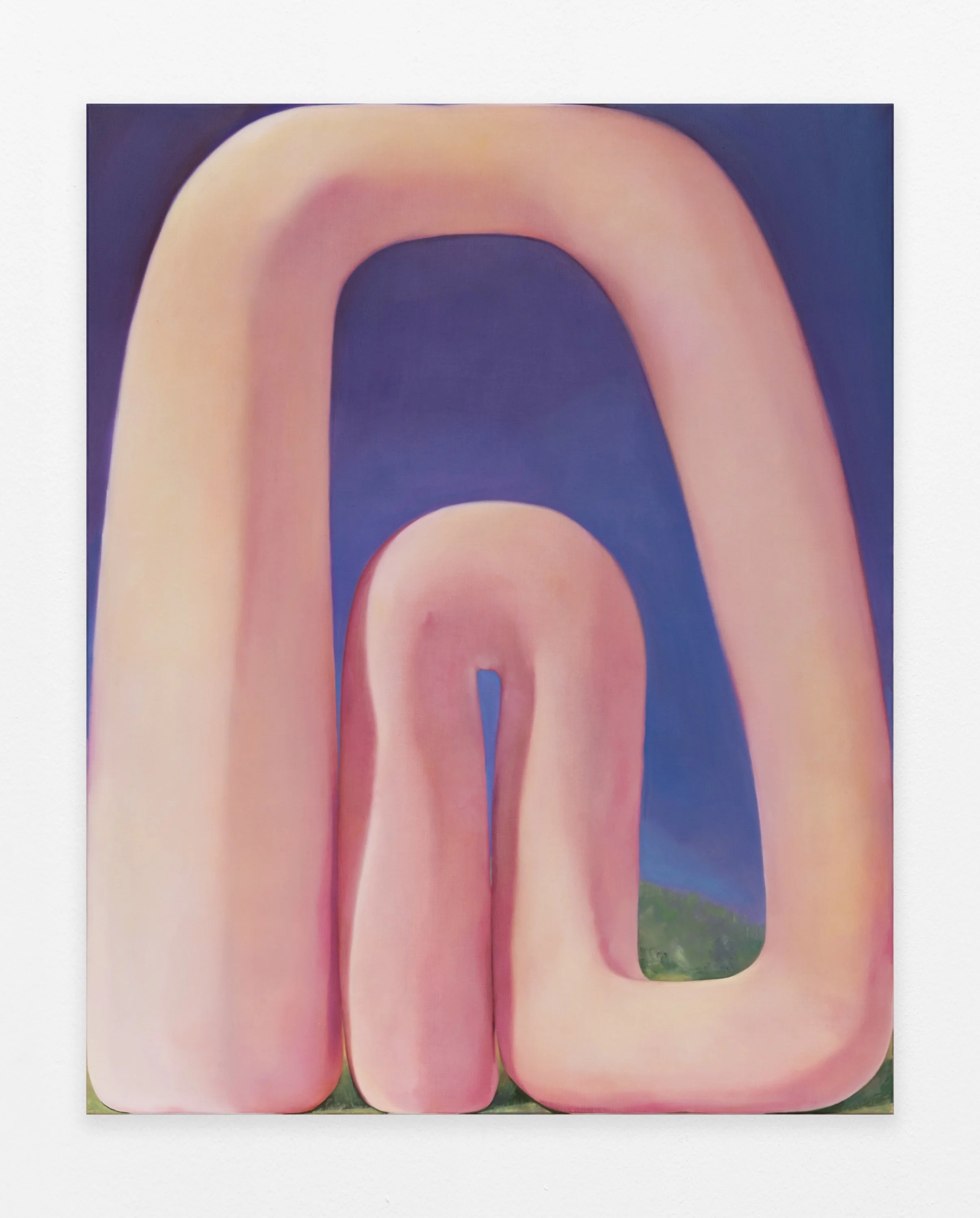 In Cuckoo Land, the body is rendered object: soft and tubular, faceless and nameless. Each composition features a curling form that is unmistakably fleshy. Plush and pillowy in texture, her forms are reminiscent of limbs or torsos that have been distended and exorcised of any phalange or protrusion that might interrupt their smooth surfaces. The limits of the forms determine the borders of the compositions themselves, making the canvas a kind of container for each of them. Reading less as people than as specimens in jars, sealed off and preserved, they lurch toward the anatomical only to recoil into the imaginary. Across the exhibition, it seems that what Whitehead depicts are alien specimens pretending to be bodily, moving through our world without narrative or soul.